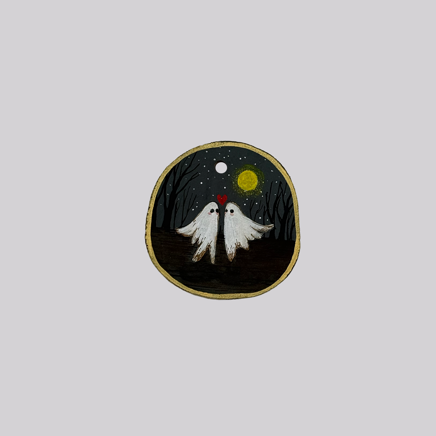 One of a kind, original hand-painted ornament (on a wood slice) with acrylic paint. Comes packaged in a box. Ready to hang for holidays or home decor. (Work is varnished and comes packaged with a string for hanging)