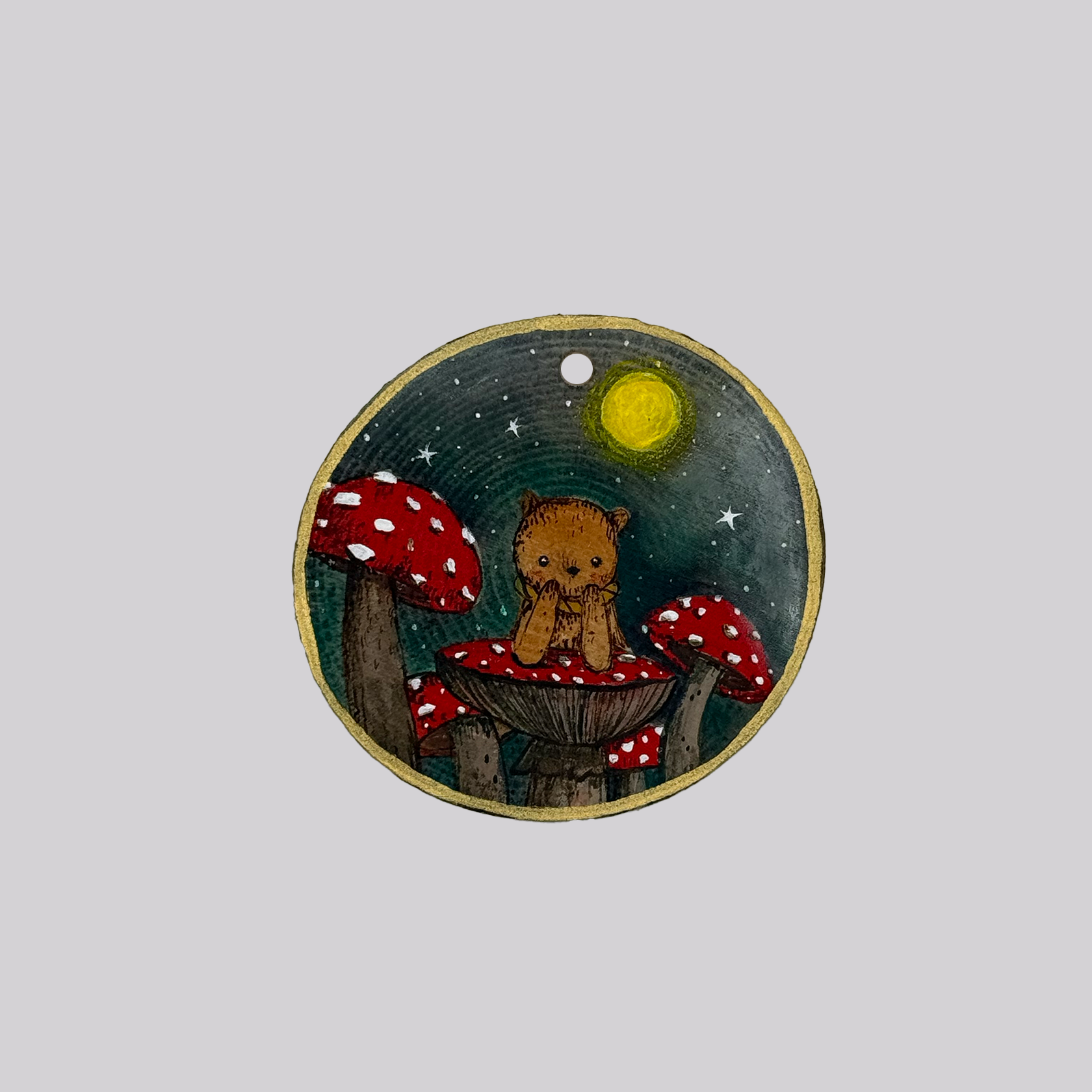 One of a kind, original hand-painted ornament (on a wood slice) with acrylic paint. Comes packaged in a box. Ready to hang for holidays or home decor. (Work is varnished and comes packaged with a string for hanging)